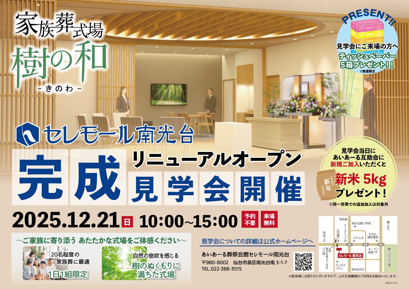12月21日(日)には、サービス内容を改めてご覧いただける「完成見学会」を開催いたしますので、ぜひこの機会に明るく温かみのある雰囲気に生まれ変わったセレモール南光台の館内をご覧ください。